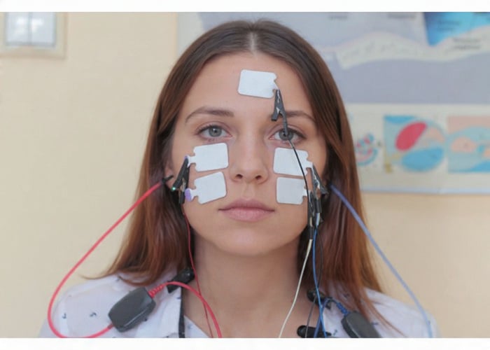 São colocados eletrodos adesivos na pele, sobre músculos do pescoço e da face;